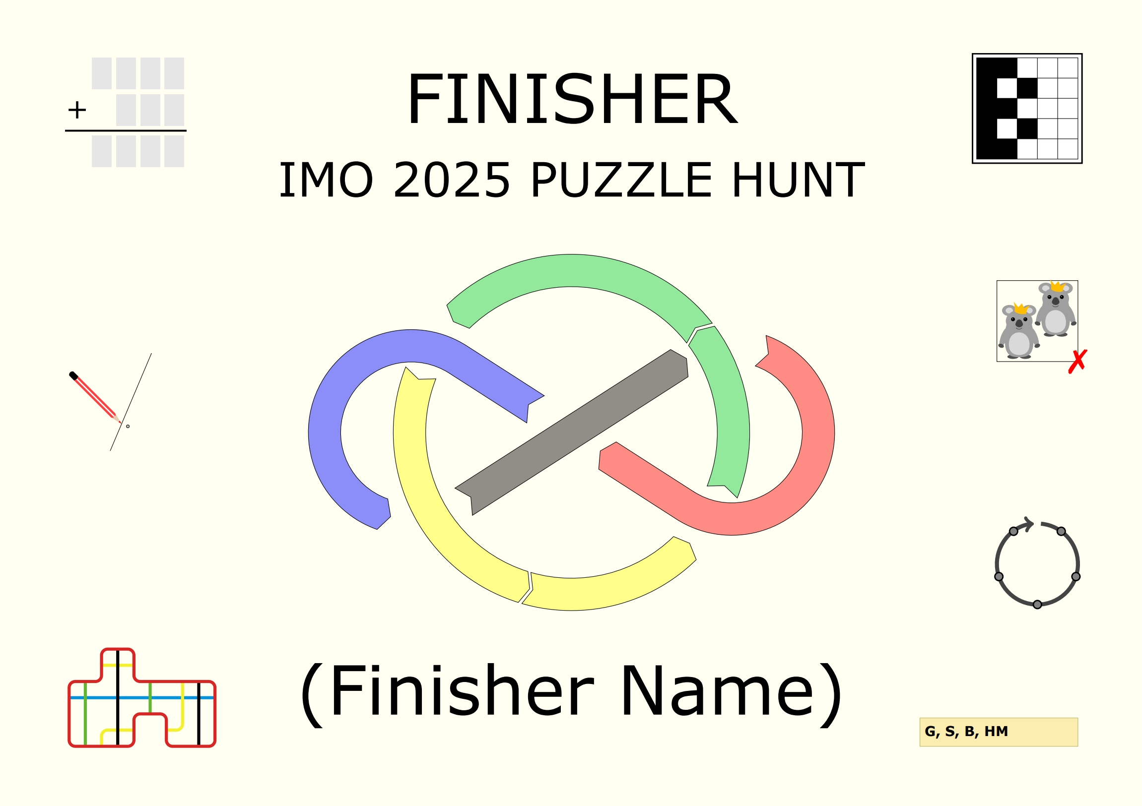 Firstly, thank you to all the IMO participants who had a go at the hunt! We hope it was at least somewhat rewarding, no matter how many puzzles you solved. It was certainly very exciting for us as organisers to see groups of contestants huddled around the hotel lobby working on the printed puzzle sets!
